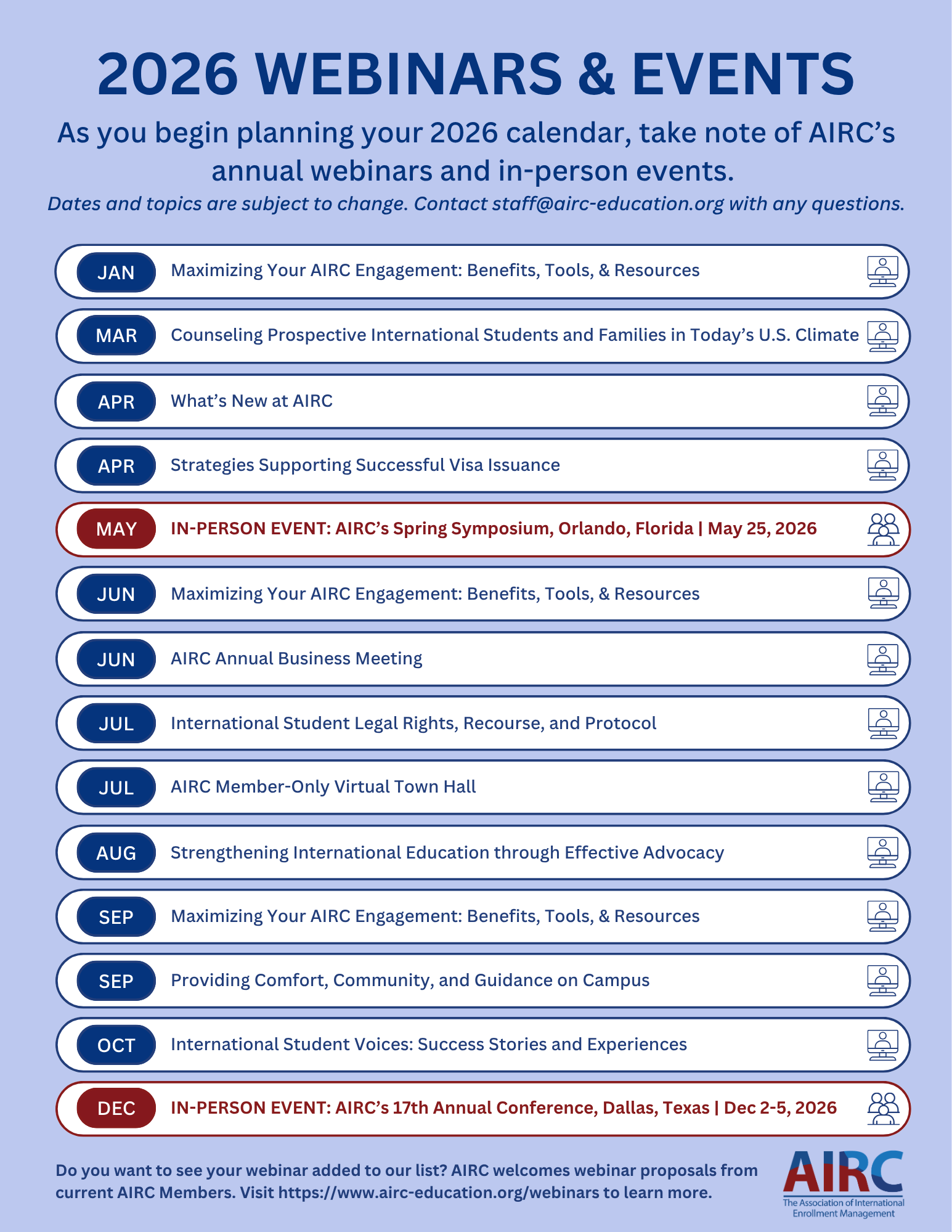 The second webinar in AIRC’s #WeAreHereForYou series will highlight how institutions, agencies, and service providers can best support their students before, during, and after the U.S. visa application process, especially in today’s climate of uncertainty. Hear directly from a former U.S. Consular Officer who adjudicated thousands of visa applications on what actually happens during a visa interview and how students can strengthen their applications. The session will also examine best practices for preparing students for the visa process, how practitioners can help in the case of a denial, and what resources are available to stay up to date on visa policy changes and implementation. A focus will be on setting realistic student expectations and offering relevant guidance to support their visa process.